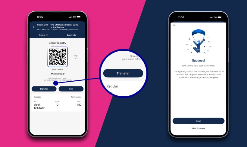 Transfer: In ‘My Tickets’, select ‘Transfer’ and enter your friend’s email address.